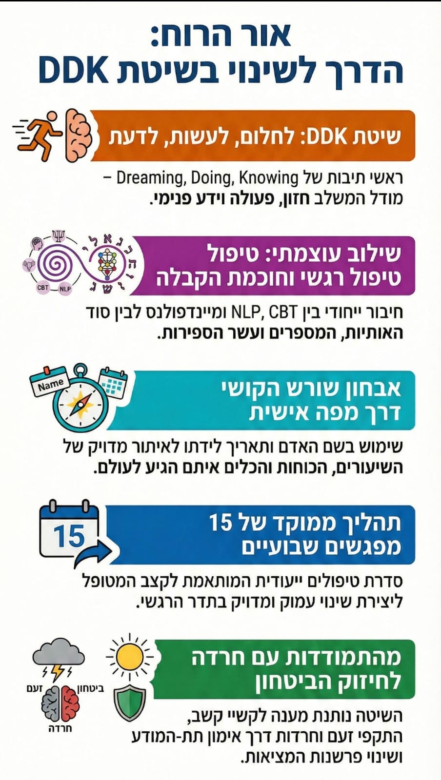 הטיפול המשלב מספר שיטות כמו cbt , nlp , מיינדפולנס, פסיכולוגיה חיובית ודמיון מודרך בקשב עמוק ושיטות נוספות מתוך תורת הקבלה .